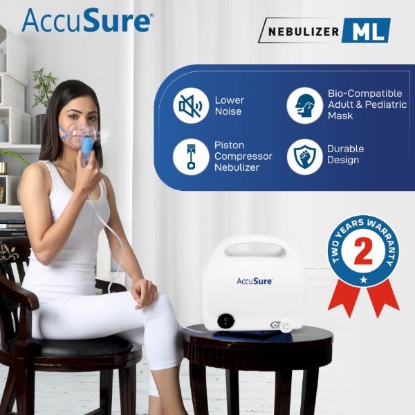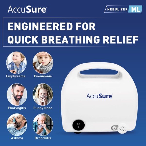 The AccuSure Portable ML Advance Nebulizer is designed to provide effective and reliable respiratory relief for people of all ages. With its compact and user-friendly design, it ensures fast delivery of medication directly to the lungs, making it ideal for managing conditions like asthma, COPD, bronchitis, cough, cold, and other respiratory issues. Equipped with certified mask kits and continuous operation capability, this nebulizer offers safe, convenient, and long-lasting performance for home use.