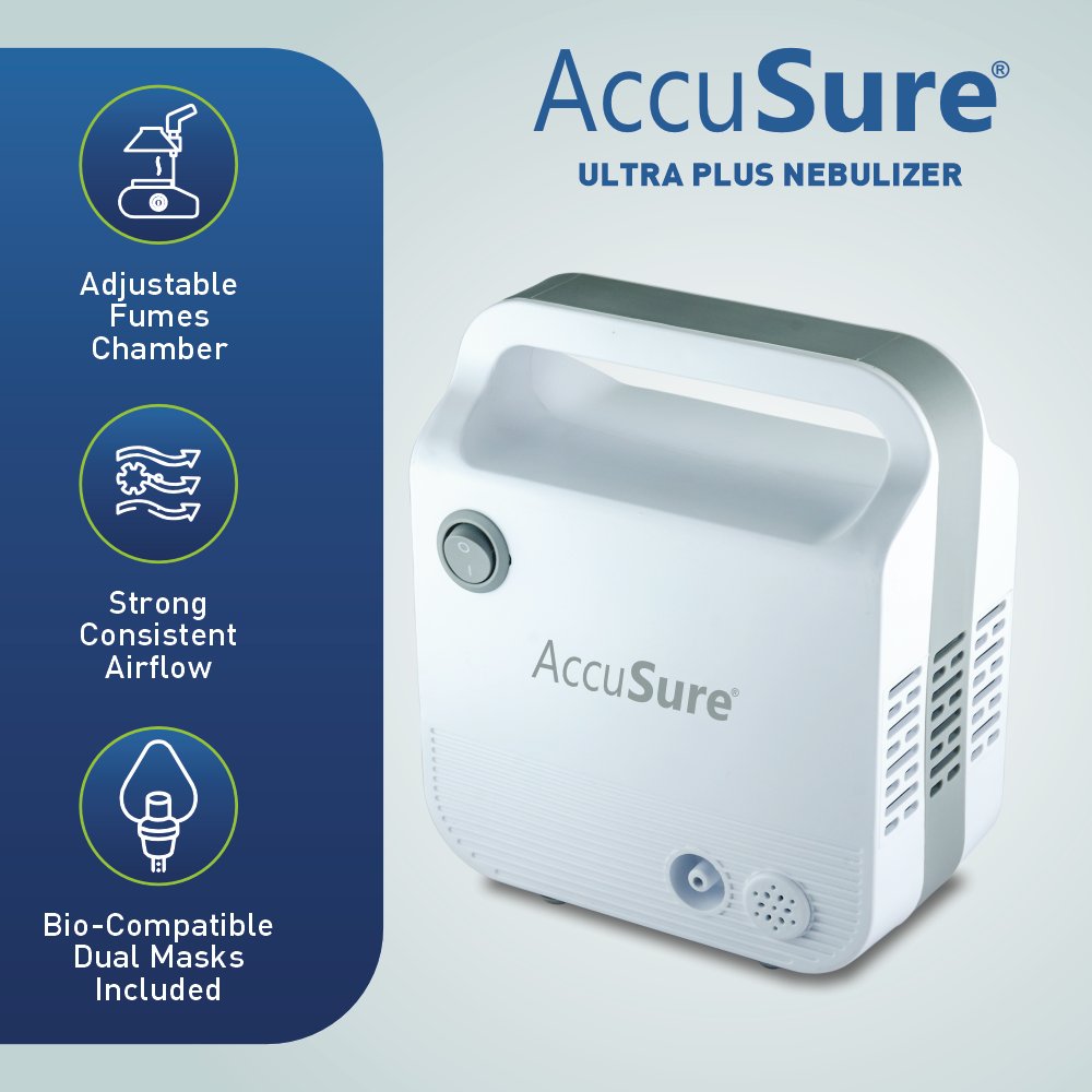 The AccuSure Ultra Plus Nebulizer is a compact, portable device with strong airflow performance. It is equipped with bio-compatible components and tested accessories for safe usage. Designed with an adjustable fumes chamber and dual mask support, it provides flexibility and convenience for users. Its lightweight structure with a carry handle makes it easy to use and move.